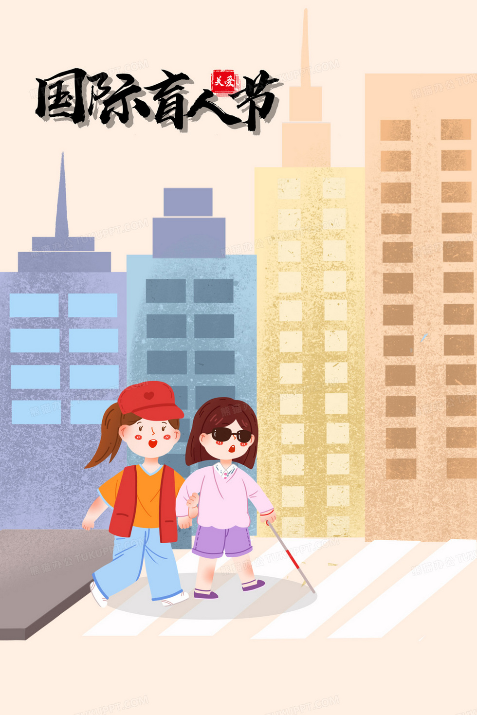 本作品内容为国际盲人节志愿者帮助小姐姐过马路插画, 格式为 psd, 大小25 MB, 请使用软件PhotoShop(CC)打开, 源文件无水印, 欢迎使用熊猫办公。 如认为平台内容涉嫌侵权,可通过邮件:tousu@tukuppt.com提出书面通知,我们将及时处理。
