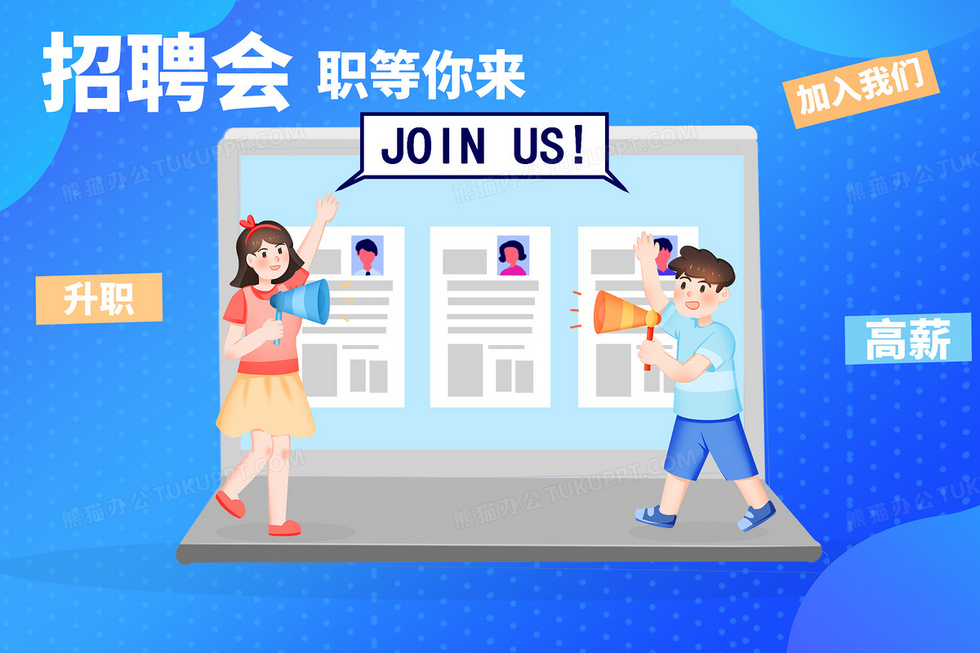 本作品内容为招聘宣传面试线上招聘插画, 格式为 psd, 大小28 MB, 请使用软件PhotoShop(CS6)打开, 源文件无水印, 欢迎使用熊猫办公。 如认为平台内容涉嫌侵权,可通过邮件:tousu@tukuppt.com提出书面通知,我们将及时处理。