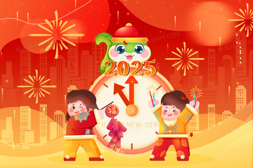 本作品内容为红色渐变2025年时钟新年卡通插画, 格式为 psd, 大小20 MB, 请使用软件PhotoShop(CC)打开, 源文件无水印, 欢迎使用熊猫办公。 如认为平台内容涉嫌侵权,可通过邮件:tousu@tukuppt.com提出书面通知,我们将及时处理。