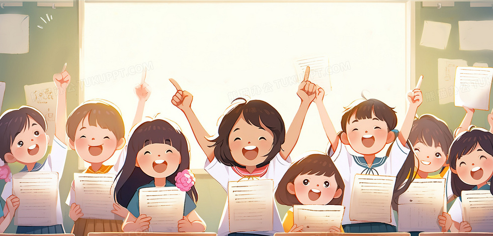 本作品内容为教室里可爱的学生们开心的高举试卷庆祝创意插画, 格式为 jpg, 大小5 MB, 图片尺寸为2912 x 1398, 源文件无水印, 欢迎使用熊猫办公。 如认为平台内容涉嫌侵权,可通过邮件:tousu@tukuppt.com提出书面通知,我们将及时处理。