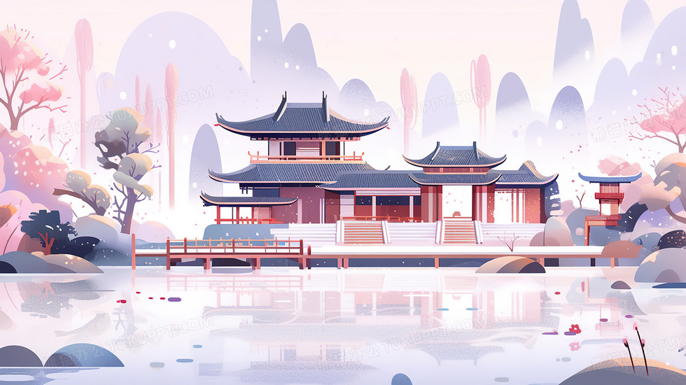 本作品内容为初冬山边湖中的中式阁楼插画, 格式为 jpg, 大小5 MB, 图片尺寸为2912 x 1632, 源文件无水印, 欢迎使用熊猫办公。 如认为平台内容涉嫌侵权,可通过邮件:tousu@tukuppt.com提出书面通知,我们将及时处理。
