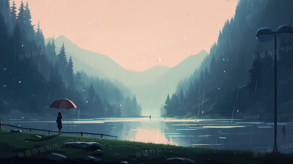 本作品内容为山谷树林湖泊的唯美雨景插画, 格式为 jpg, 大小4 MB, 图片尺寸为2912 x 1632, 源文件无水印, 欢迎使用熊猫办公。 如认为平台内容涉嫌侵权,可通过邮件:tousu@tukuppt.com提出书面通知,我们将及时处理。