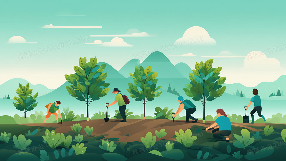 本作品内容为在山旁种树的人们插画, 格式为 jpg, 大小5 MB, 图片尺寸为2912 x 1632, 源文件无水印, 欢迎使用熊猫办公。 如认为平台内容涉嫌侵权,可通过邮件:tousu@tukuppt.com提出书面通知,我们将及时处理。