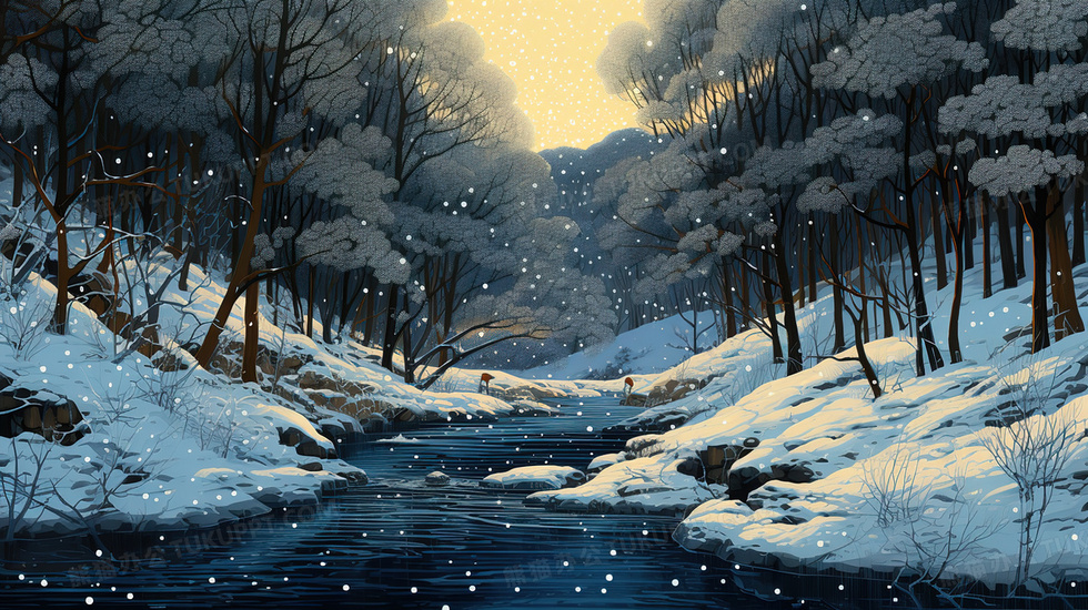 首页 > 插画 > 科技艺术 > 水彩手绘 > 冬季雪地森林溪流唯美雪景插画