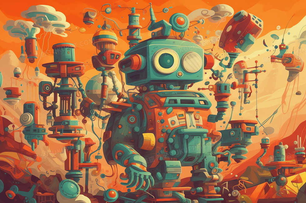 本作品内容为巨大的彩色机器人周围悬浮着很多小机器人创意插画, 格式为 jpg, 大小5 MB, 图片尺寸为2688 x 1792, 源文件无水印, 欢迎使用熊猫办公。 如认为平台内容涉嫌侵权,可通过邮件:tousu@tukuppt.com提出书面通知,我们将及时处理。