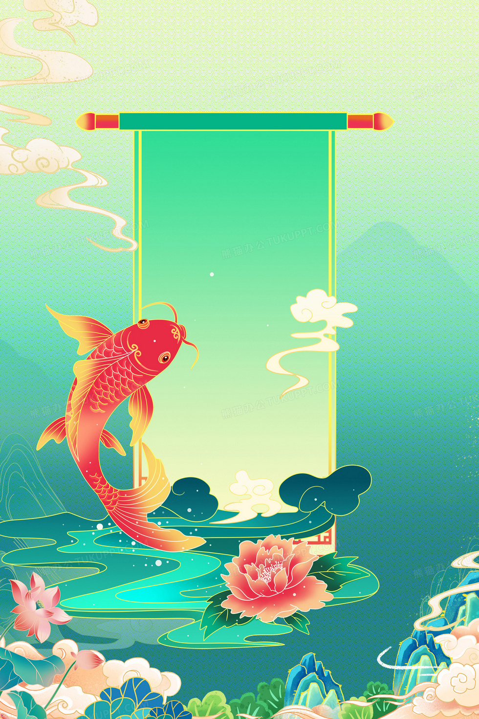 本作品内容为2023国潮锦鲤红绿卷轴竖版背景, 格式为 psd, 大小83 MB, 图片尺寸为3543 x 5314, 作品中背景图片无需修改, 源文件无水印,可以直接使用, 欢迎使用熊猫办公。 如认为平台内容涉嫌侵权,可通过邮件:tousu@tukuppt.com提出书面通知,我们将及时处理。