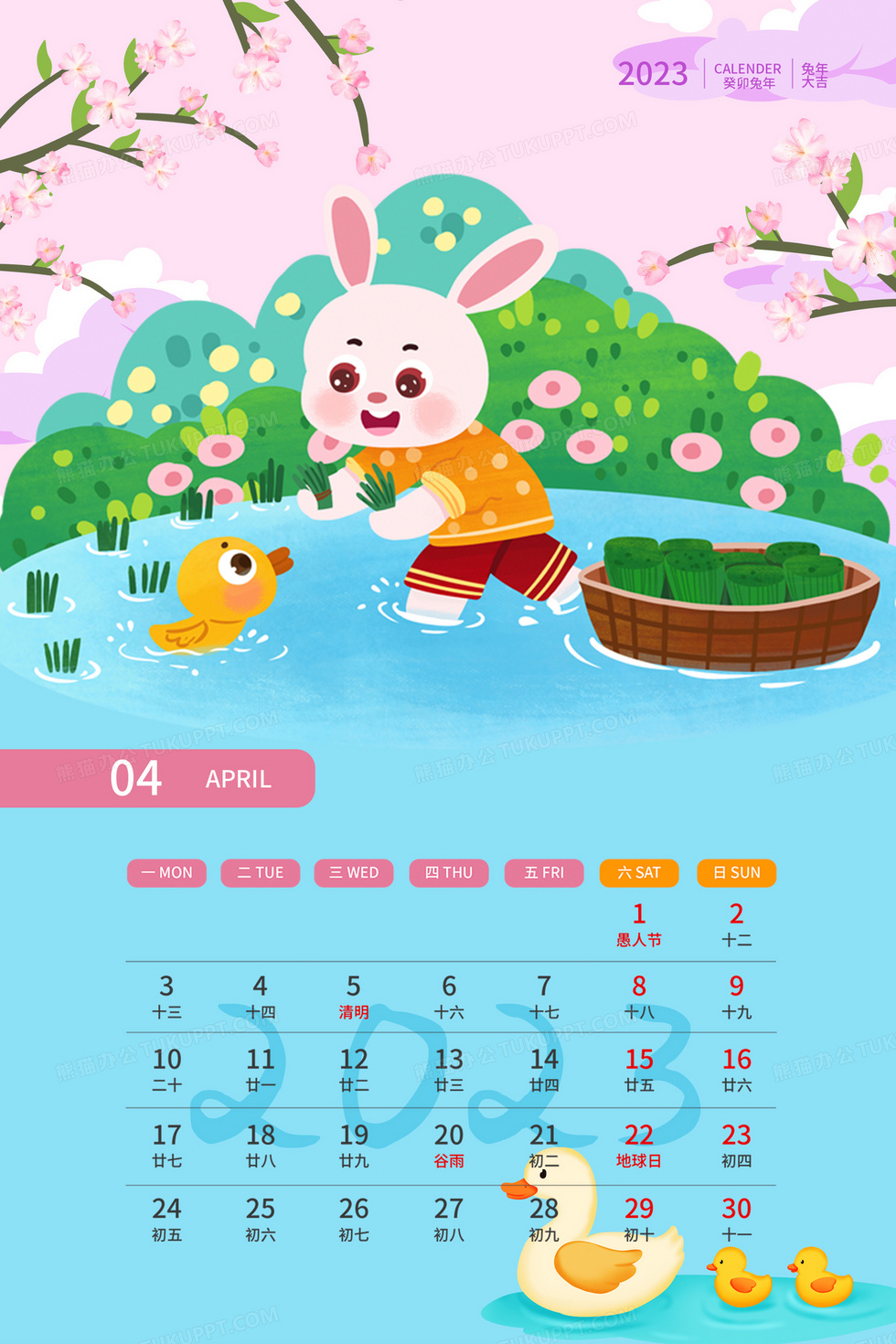 本作品内容为卡通兔年4月卡通可爱日历, 格式为 psd, 大小18 MB, 图片尺寸为2362 x 3543, 作品中背景图片无需修改, 源文件无水印,可以直接使用, 欢迎使用熊猫办公。 如认为平台内容涉嫌侵权,可通过邮件:tousu@tukuppt.com提出书面通知,我们将及时处理。