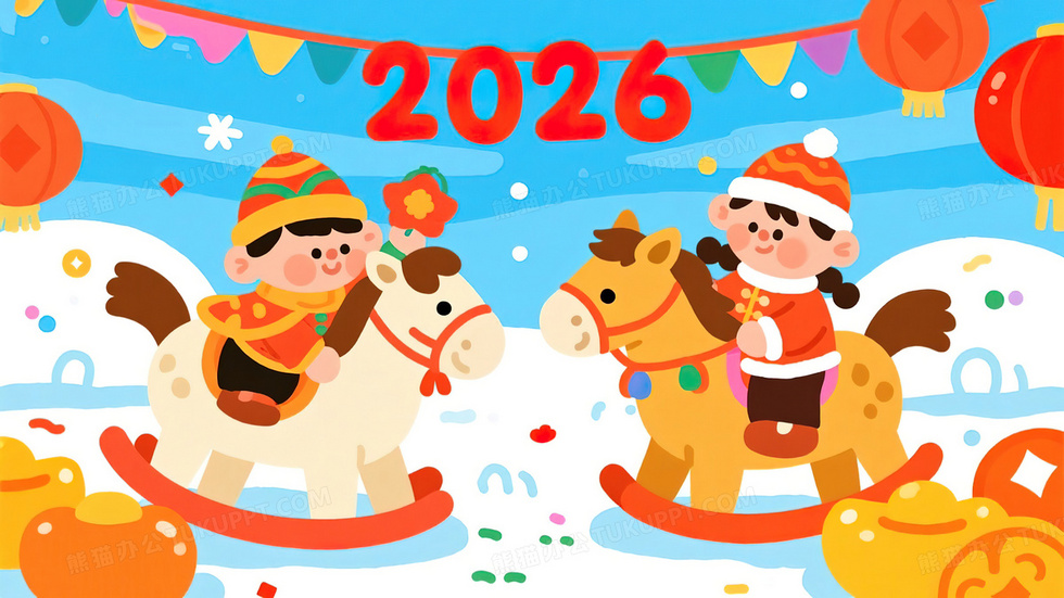 本作品内容为马年春节男孩女孩开心的骑木马喜庆插画, 格式为 jpg, 大小5 MB, 图片尺寸为3328 x 1872, 源文件无水印, 欢迎使用熊猫办公。 如认为平台内容涉嫌侵权,可通过邮件:tousu@tukuppt.com提出书面通知,我们将及时处理。
