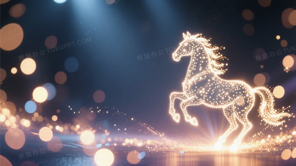 本作品内容为画面右下角是粒子光效组成的骏马形象, 格式为 jpg, 大小1 MB, 图片尺寸为1664 x 936, 作品中背景图片无需修改, 源文件无水印,可以直接使用, 欢迎使用熊猫办公。 如认为平台内容涉嫌侵权,可通过邮件:tousu@tukuppt.com提出书面通知,我们将及时处理。