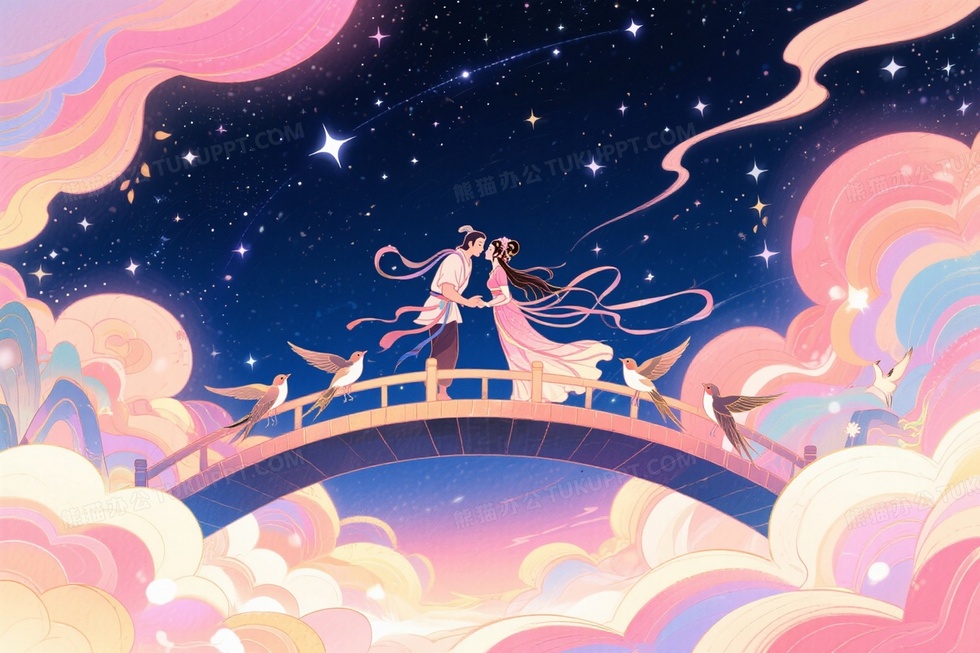 本作品内容为牛郎织女在喜鹊搭建的鹊桥上深情相会, 格式为 jpg, 大小1 MB, 图片尺寸为1584 x 1056, 源文件无水印, 欢迎使用熊猫办公。 如认为平台内容涉嫌侵权,可通过邮件:tousu@tukuppt.com提出书面通知,我们将及时处理。