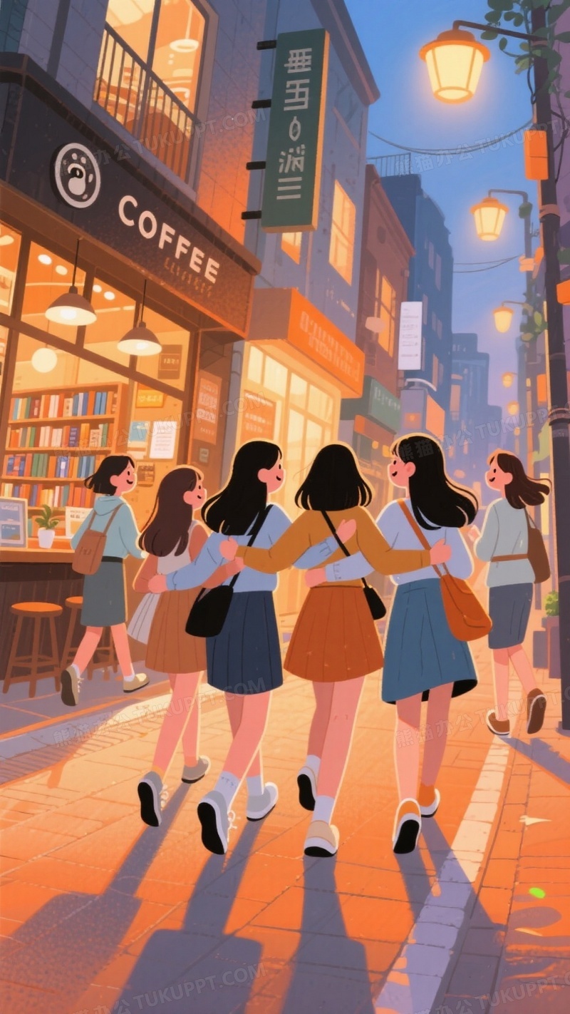 本作品内容为温馨卡通插画一群女孩勾肩搭背开心逛街, 格式为 jpg, 大小1 MB, 图片尺寸为936 x 1664, 源文件无水印, 欢迎使用熊猫办公。 如认为平台内容涉嫌侵权,可通过邮件:tousu@tukuppt.com提出书面通知,我们将及时处理。