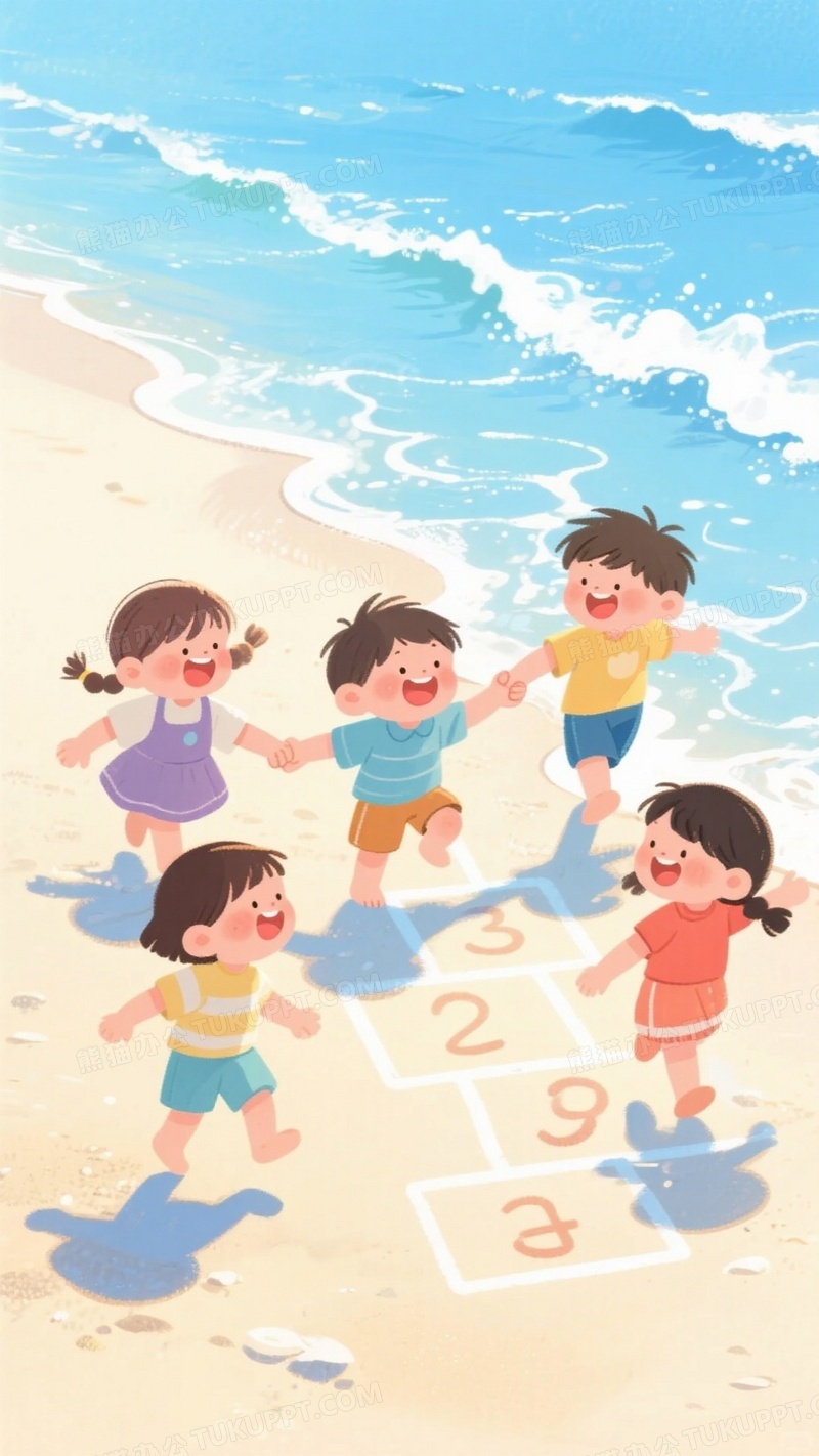 本作品内容为清新卡通插画5个小朋友手牵手在蓝色海边沙滩上玩跳房子游戏, 格式为 jpg, 大小1 MB, 图片尺寸为936 x 1664, 源文件无水印, 欢迎使用熊猫办公。 如认为平台内容涉嫌侵权,可通过邮件:tousu@tukuppt.com提出书面通知,我们将及时处理。