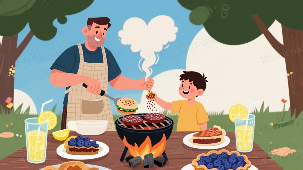 本作品内容为父子烧烤派对卡通图爸爸翻动汉堡肉饼教孩子撒调料, 格式为 jpg, 大小1 MB, 图片尺寸为1664 x 936, 源文件无水印, 欢迎使用熊猫办公。 如认为平台内容涉嫌侵权,可通过邮件:tousu@tukuppt.com提出书面通知,我们将及时处理。