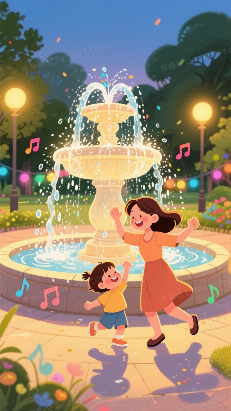 本作品内容为可爱插画画面妈妈和小朋友在公园的音乐喷泉旁跳舞, 格式为 jpg, 大小1 MB, 图片尺寸为936 x 1664, 源文件无水印, 欢迎使用熊猫办公。 如认为平台内容涉嫌侵权,可通过邮件:tousu@tukuppt.com提出书面通知,我们将及时处理。