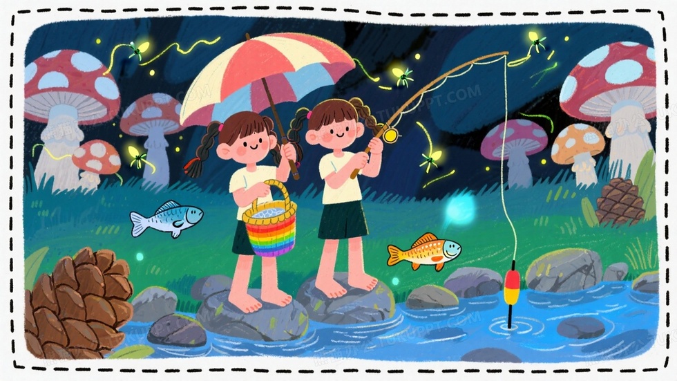 蜡笔质感卡通场景双马尾女孩赤脚踩溪石执钓竿