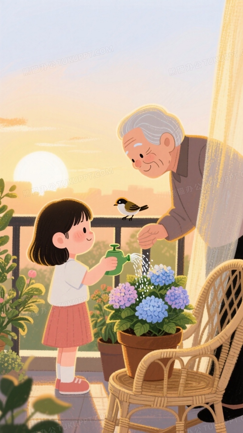 本作品内容为温馨夕阳场景插画祖孙二人打理阳台绿植, 格式为 jpg, 大小1 MB, 图片尺寸为936 x 1664, 源文件无水印, 欢迎使用熊猫办公。 如认为平台内容涉嫌侵权,可通过邮件:tousu@tukuppt.com提出书面通知,我们将及时处理。