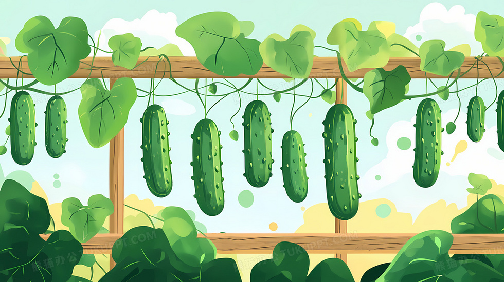 本作品内容为农业农场中的黄瓜插画, 格式为 jpg, 大小3 MB, 图片尺寸为2912 x 1632, 源文件无水印, 欢迎使用熊猫办公。 如认为平台内容涉嫌侵权,可通过邮件:tousu@tukuppt.com提出书面通知,我们将及时处理。