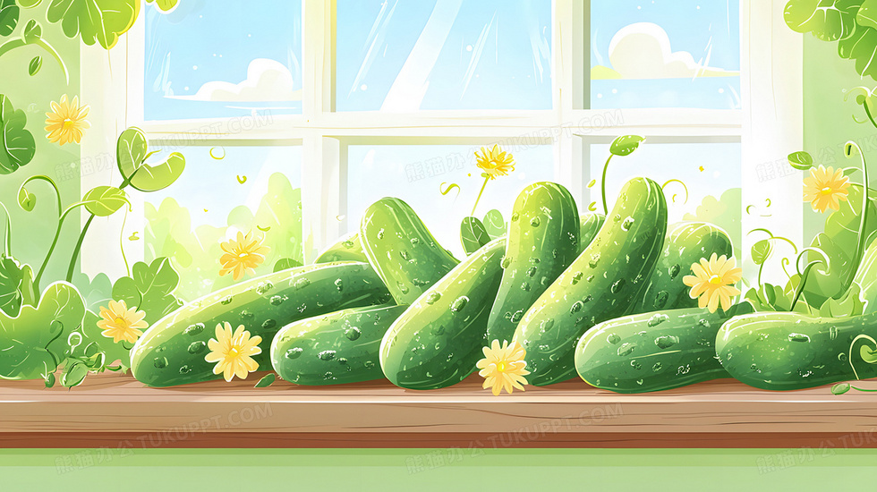 本作品内容为卡通风格蔬菜新鲜食材青瓜黄瓜插画, 格式为 jpg, 大小3 MB, 图片尺寸为2912 x 1632, 源文件无水印, 欢迎使用熊猫办公。 如认为平台内容涉嫌侵权,可通过邮件:tousu@tukuppt.com提出书面通知,我们将及时处理。