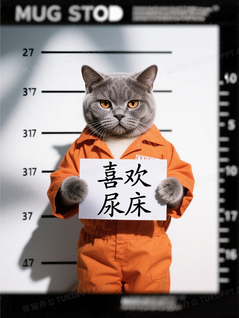 本作品内容为超现实主义真实质感十分可爱的英国短毛猫身穿橙色囚服, 格式为 jpg, 大小1 MB, 图片尺寸为1104 x 1472, 源文件无水印, 欢迎使用熊猫办公。 如认为平台内容涉嫌侵权,可通过邮件:tousu@tukuppt.com提出书面通知,我们将及时处理。