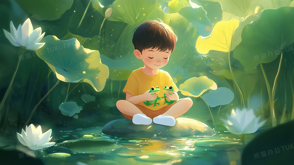 本作品内容为荷花男孩青蛙夏天唯美风景插画, 格式为 jpg, 大小3 MB, 图片尺寸为2912 x 1632, 源文件无水印, 欢迎使用熊猫办公。 如认为平台内容涉嫌侵权,可通过邮件:tousu@tukuppt.com提出书面通知,我们将及时处理。