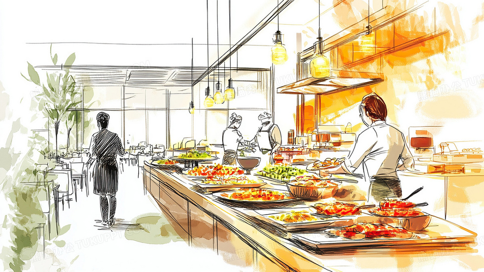 本作品内容为手绘风自助餐场景插画, 格式为 jpg, 大小4 MB, 图片尺寸为2912 x 1632, 源文件无水印, 欢迎使用熊猫办公。 如认为平台内容涉嫌侵权,可通过邮件:tousu@tukuppt.com提出书面通知,我们将及时处理。