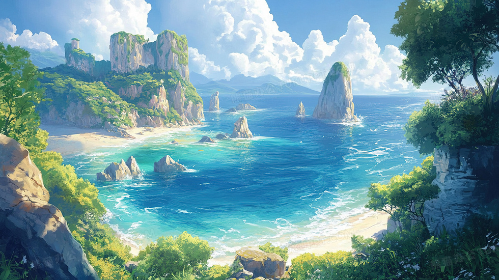 本作品内容为海洋岛礁自然风景插画, 格式为 jpg, 大小4 MB, 图片尺寸为2912 x 1632, 源文件无水印, 欢迎使用熊猫办公。 如认为平台内容涉嫌侵权,可通过邮件:tousu@tukuppt.com提出书面通知,我们将及时处理。