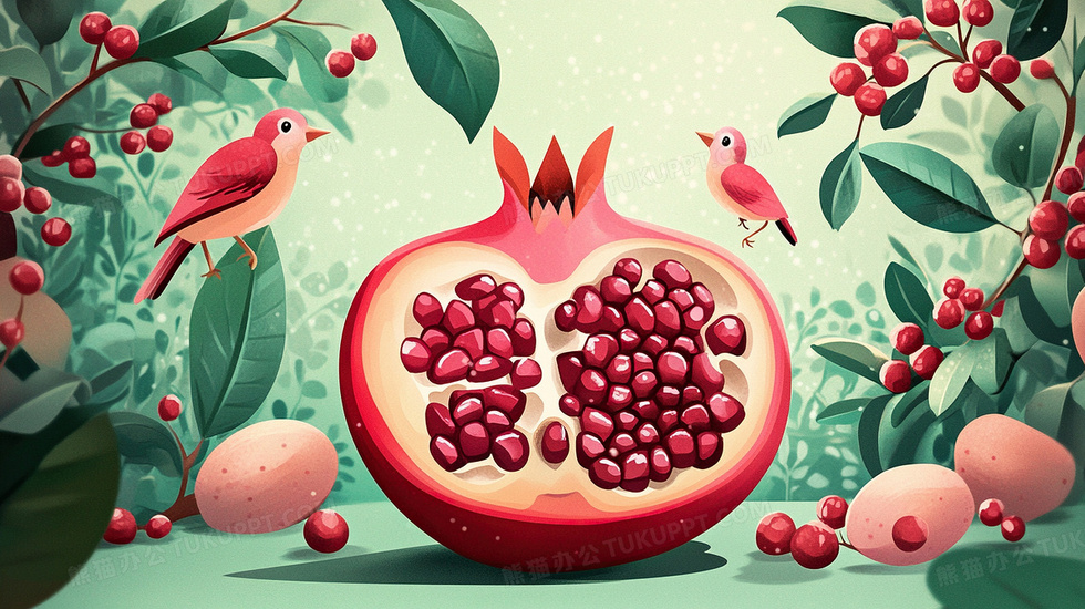 本作品内容为红石榴诱人新鲜水果插画, 格式为 jpg, 大小4 MB, 图片尺寸为2912 x 1632, 源文件无水印, 欢迎使用熊猫办公。 如认为平台内容涉嫌侵权,可通过邮件:tousu@tukuppt.com提出书面通知,我们将及时处理。