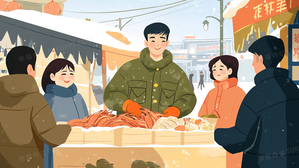 本作品内容为东北早市上卖海鲜的摊贩场景插画, 格式为 jpg, 大小2 MB, 图片尺寸为2912 x 1632, 源文件无水印, 欢迎使用熊猫办公。 如认为平台内容涉嫌侵权,可通过邮件:tousu@tukuppt.com提出书面通知,我们将及时处理。