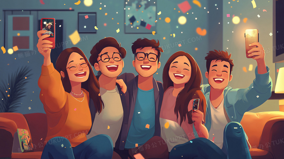 本作品内容为朋友聚会沙发上拍照插画, 格式为 jpg, 大小6 MB, 图片尺寸为2912 x 1632, 源文件无水印, 欢迎使用熊猫办公。 如认为平台内容涉嫌侵权,可通过邮件:tousu@tukuppt.com提出书面通知,我们将及时处理。