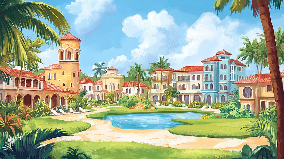 本作品内容为度假村旅游度假风景插画, 格式为 jpg, 大小1 MB, 图片尺寸为2912 x 1632, 源文件无水印, 欢迎使用熊猫办公。 如认为平台内容涉嫌侵权,可通过邮件:tousu@tukuppt.com提出书面通知,我们将及时处理。