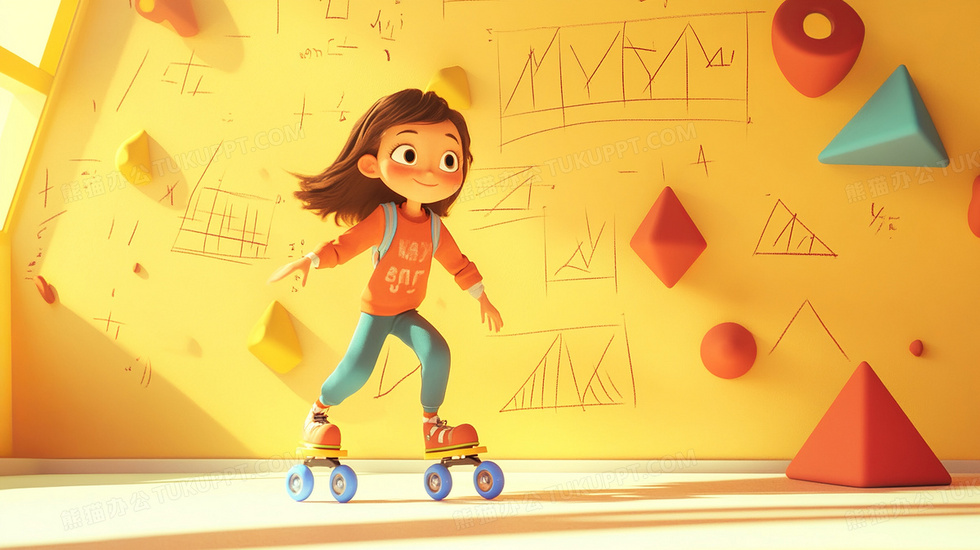 本作品内容为一个学生踩着滑轮几何图形墙壁前的卡通插画, 格式为 jpg, 大小3 MB, 图片尺寸为2912 x 1632, 源文件无水印, 欢迎使用熊猫办公。 如认为平台内容涉嫌侵权,可通过邮件:tousu@tukuppt.com提出书面通知,我们将及时处理。