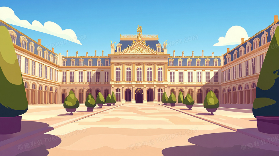 本作品内容为欧式建筑凡尔赛宫插画, 格式为 jpg, 大小3 MB, 图片尺寸为2912 x 1632, 源文件无水印, 欢迎使用熊猫办公。 如认为平台内容涉嫌侵权,可通过邮件:tousu@tukuppt.com提出书面通知,我们将及时处理。