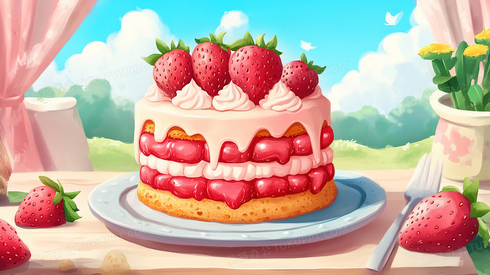 本作品内容为祝贺生日节日草莓蛋糕插画, 格式为 jpg, 大小3 MB, 图片尺寸为2912 x 1632, 源文件无水印, 欢迎使用熊猫办公。 如认为平台内容涉嫌侵权,可通过邮件:tousu@tukuppt.com提出书面通知,我们将及时处理。