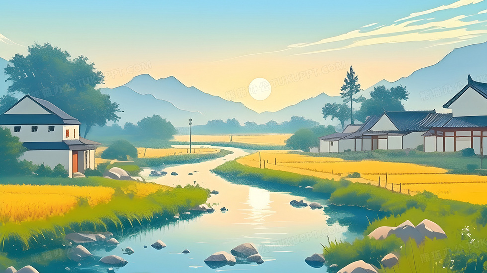 本作品内容为唯美清新河流旁的房子插画, 格式为 jpg, 大小3 MB, 图片尺寸为2912 x 1632, 源文件无水印, 欢迎使用熊猫办公。 如认为平台内容涉嫌侵权,可通过邮件:tousu@tukuppt.com提出书面通知,我们将及时处理。