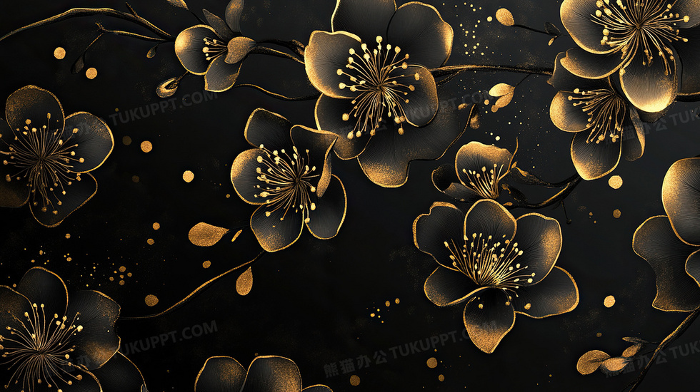 本作品内容为黑色烫金风梅花背景, 格式为 jpg, 大小4 MB, 图片尺寸为2912 x 1632, 作品中背景图片无需修改, 源文件无水印,可以直接使用, 欢迎使用熊猫办公。 如认为平台内容涉嫌侵权,可通过邮件:tousu@tukuppt.com提出书面通知,我们将及时处理。