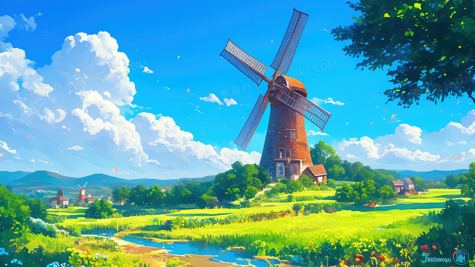 本作品内容为蔚蓝天空大自然草地美丽荷兰风车插画, 格式为 jpg, 大小3 MB, 图片尺寸为2912 x 1632, 源文件无水印, 欢迎使用熊猫办公。 如认为平台内容涉嫌侵权,可通过邮件:tousu@tukuppt.com提出书面通知,我们将及时处理。