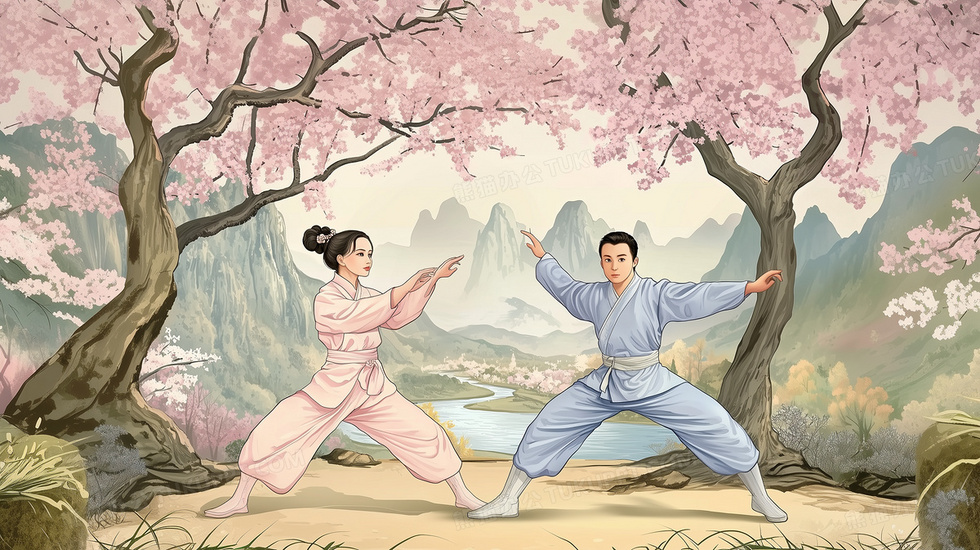 本作品内容为身着中国传统服装的青年男女在樱花掩映下练习太极插画, 格式为 jpg, 大小8 MB, 图片尺寸为2912 x 1632, 源文件无水印, 欢迎使用熊猫办公。 如认为平台内容涉嫌侵权,可通过邮件:tousu@tukuppt.com提出书面通知,我们将及时处理。