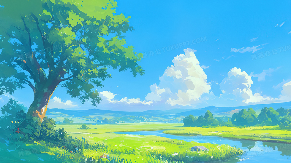 本作品内容为春天草地蓝天白云大自然风景插画, 格式为 jpg, 大小4 MB, 图片尺寸为2912 x 1632, 源文件无水印, 欢迎使用熊猫办公。 如认为平台内容涉嫌侵权,可通过邮件:tousu@tukuppt.com提出书面通知,我们将及时处理。