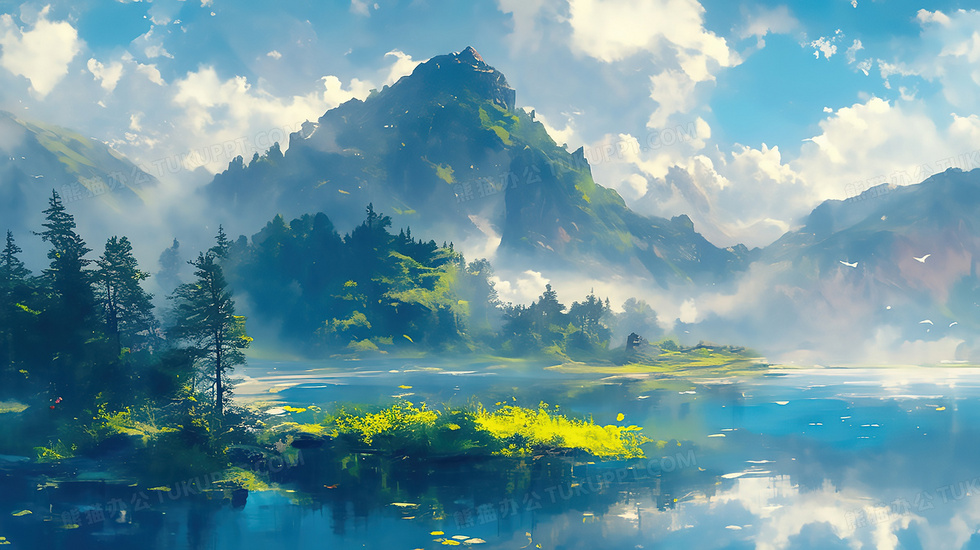 首页 > 插画 > 科技艺术 > 水彩手绘 > 水彩风森林树木植物风景蓝天白云插画