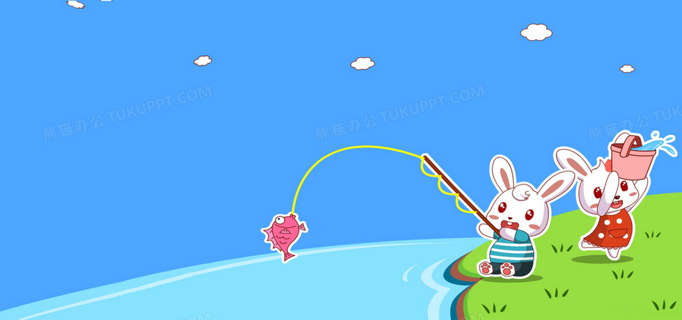 本作品内容为简约卡通小兔钓鱼背景图, 格式为 jpg, 图片尺寸为1920 x 900, 作品中背景图片无需修改, 源文件无水印,可以直接使用, 欢迎使用熊猫办公。 如认为平台内容涉嫌侵权,可通过邮件:tousu@tukuppt.com提出书面通知,我们将及时处理。