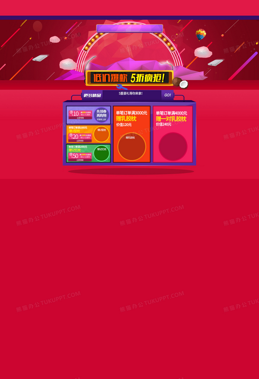 本作品内容为红色立体几何家电数码店铺首页背景, 格式为 psd, 图片尺寸为1920 x 2812, 作品中背景图片无需修改, 源文件无水印,可以直接使用, 欢迎使用熊猫办公。 如认为平台内容涉嫌侵权,可通过邮件:tousu@tukuppt.com提出书面通知,我们将及时处理。