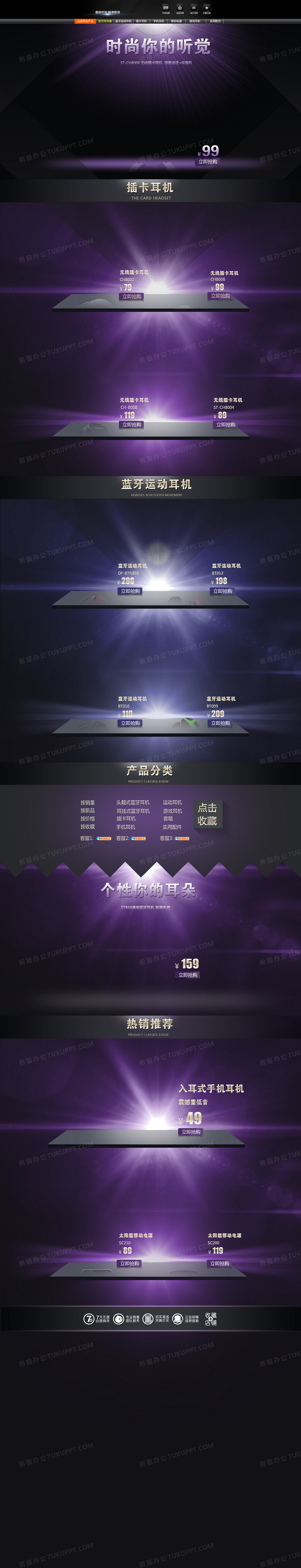 本作品内容为淘宝天猫耳机首页背景模板, 格式为 psd, 图片尺寸为1920 x 10000, 作品中背景图片无需修改, 源文件无水印,可以直接使用, 欢迎使用熊猫办公。 如认为平台内容涉嫌侵权,可通过邮件:tousu@tukuppt.com提出书面通知,我们将及时处理。