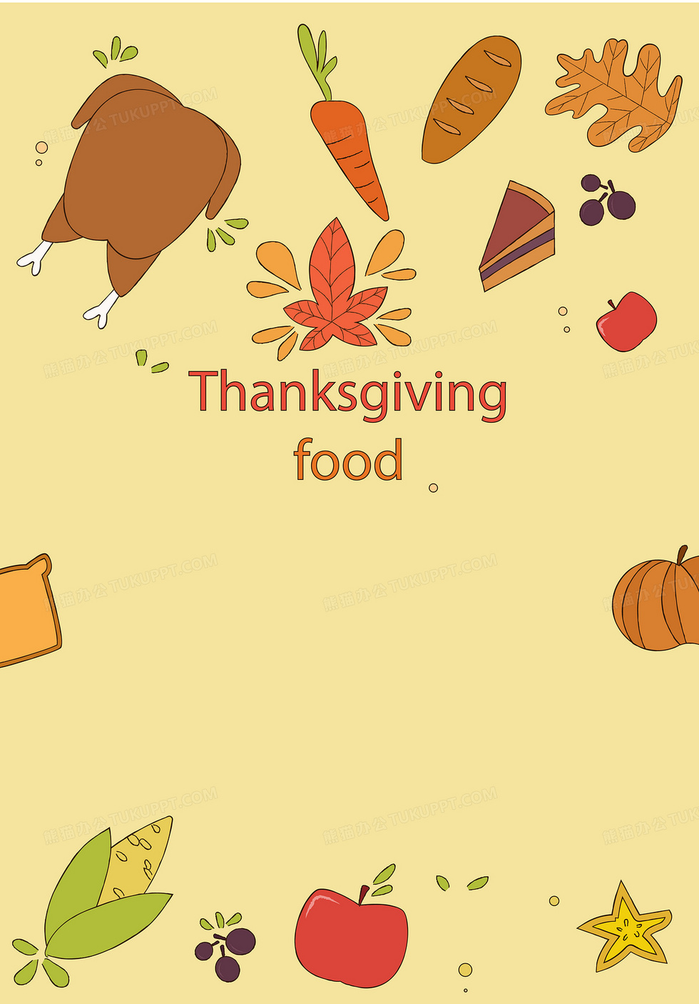 本作品内容为卡通手绘感恩节食物宣传海报, 格式为 ai, 图片尺寸为3652 x 5241, 作品中背景图片无需修改, 源文件无水印,可以直接使用, 欢迎使用熊猫办公。 如认为平台内容涉嫌侵权,可通过邮件:tousu@tukuppt.com提出书面通知,我们将及时处理。
