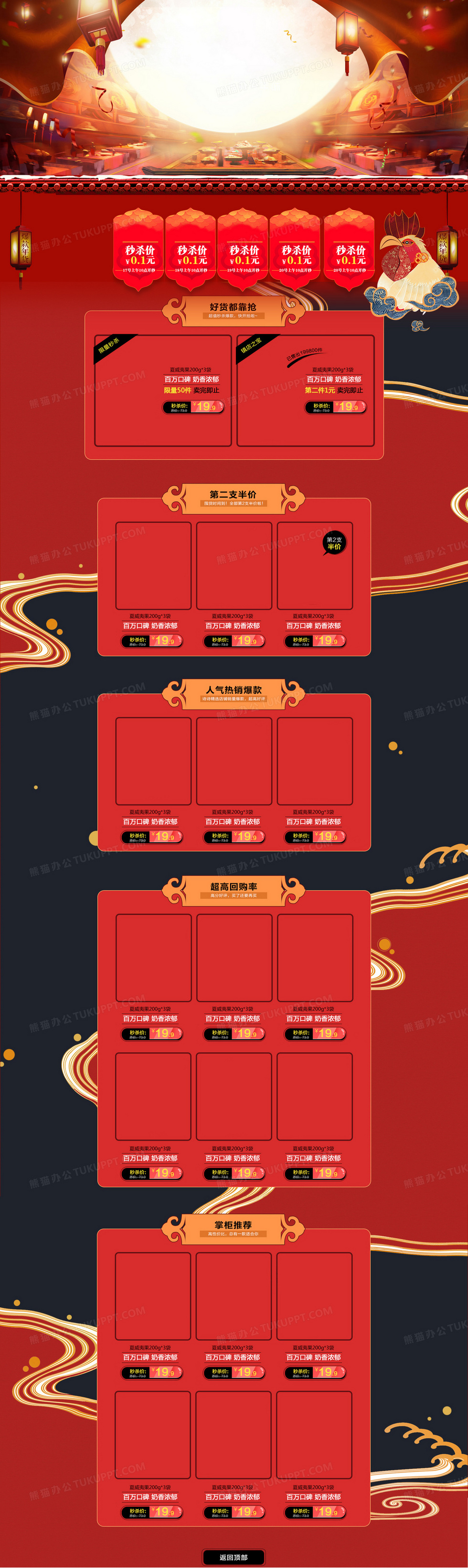 本作品内容为2017鸡年红色狂欢元宵节食品店铺首页背, 格式为 psd, 图片尺寸为1920 x 6434, 作品中背景图片无需修改, 源文件无水印,可以直接使用, 欢迎使用熊猫办公。 如认为平台内容涉嫌侵权,可通过邮件:tousu@tukuppt.com提出书面通知,我们将及时处理。