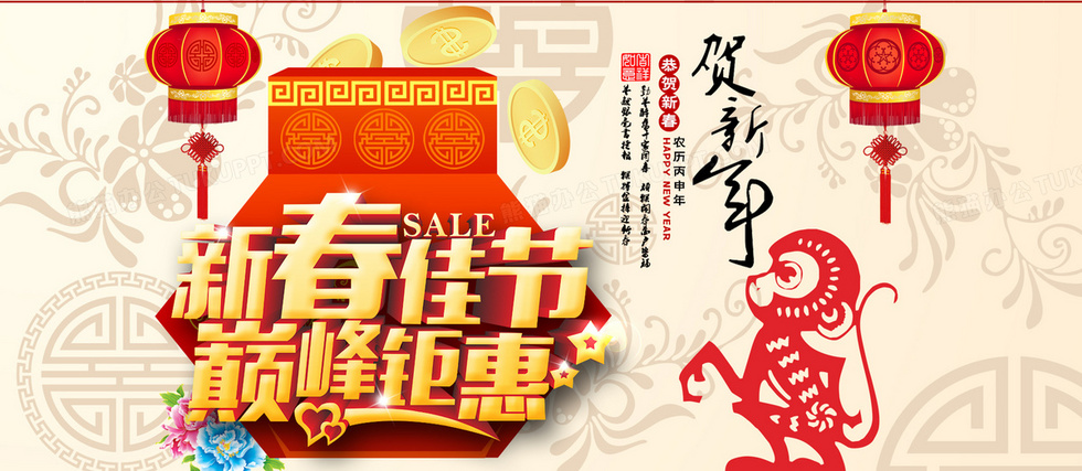 本作品内容为天猫新春促销全屏海报设计PSD源文件, 格式为 psd, 图片尺寸为1920 x 837, 作品中背景图片无需修改, 源文件无水印,可以直接使用, 欢迎使用熊猫办公。 如认为平台内容涉嫌侵权,可通过邮件:tousu@tukuppt.com提出书面通知,我们将及时处理。