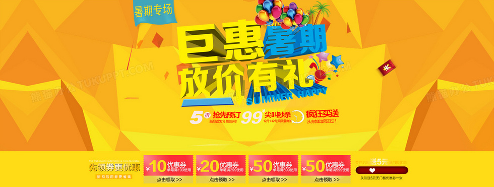 本作品内容为淘宝几何暑假背景, 格式为 psd, 图片尺寸为1920 x 726, 作品中背景图片无需修改, 源文件无水印,可以直接使用, 欢迎使用熊猫办公。 如认为平台内容涉嫌侵权,可通过邮件:tousu@tukuppt.com提出书面通知,我们将及时处理。