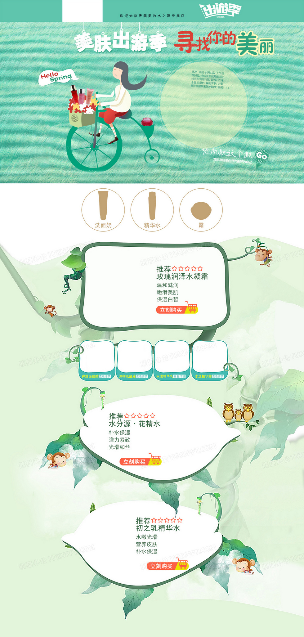 本作品内容为绿色卡通化妆品店铺首页背景, 格式为 psd, 图片尺寸为1920 x 4023, 作品中背景图片无需修改, 源文件无水印,可以直接使用, 欢迎使用熊猫办公。 如认为平台内容涉嫌侵权,可通过邮件:tousu@tukuppt.com提出书面通知,我们将及时处理。