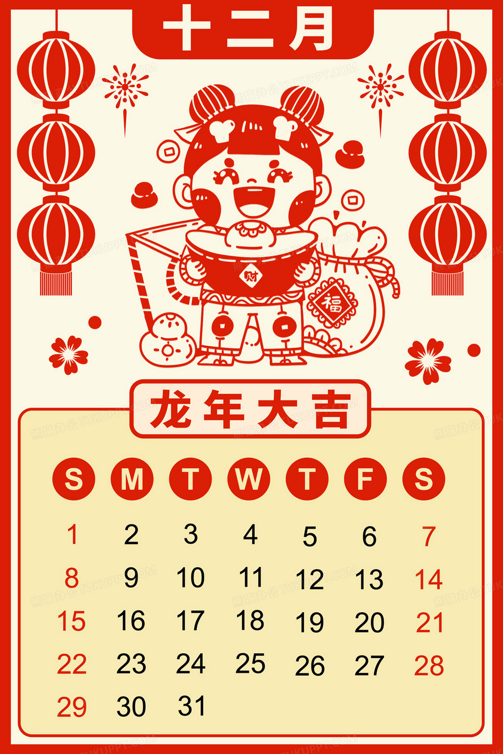 本作品内容为2024龙年年红色剪纸风竖版日历12月插画, 格式为 psd, 大小10 MB, 请使用软件PhotoShop(CC)打开, 源文件无水印, 欢迎使用熊猫办公。 如认为平台内容涉嫌侵权,可通过邮件:tousu@tukuppt.com提出书面通知,我们将及时处理。