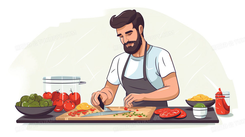 本作品内容为家庭主夫烹饪美食人物插画, 格式为 jpg, 大小4 MB, 图片尺寸为2912 x 1632, 源文件无水印, 欢迎使用熊猫办公。 如认为平台内容涉嫌侵权,可通过邮件:tousu@tukuppt.com提出书面通知,我们将及时处理。