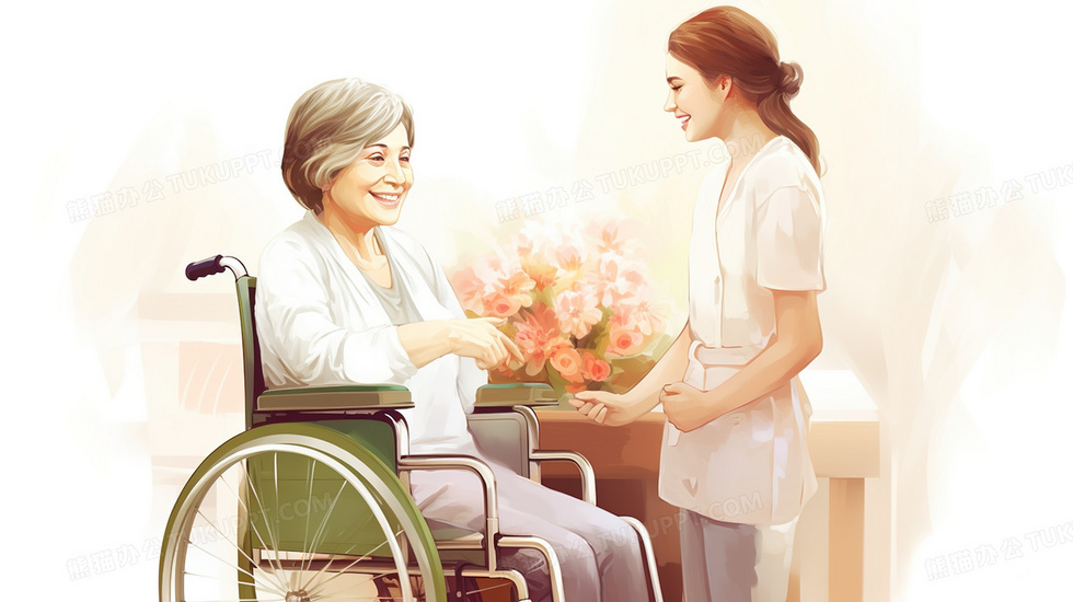 本作品内容为疗养院陪伴坐在轮椅上的老人的年轻人温馨插画, 格式为 jpg, 大小4 MB, 图片尺寸为2912 x 1632, 源文件无水印, 欢迎使用熊猫办公。 如认为平台内容涉嫌侵权,可通过邮件:tousu@tukuppt.com提出书面通知,我们将及时处理。